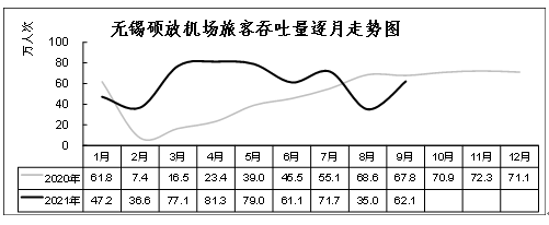 受疫情反弹影响机场暑运客流骤降。苏南硕放国际机场积极面对全球疫情持续蔓延和国内广深地区疫情突发等情况,加大客货运航线开辟力度,通过将国际时刻置换给国内航班,提高时刻资源使用率,做大国内循环规模。今年上半年,苏南硕放国际机场客货吐量已基本恢复至2019年正常水平。受省内疫情反弹影响,暑运期间机场客流骤降。据统计,前三季度,苏南硕放机场共完成起降架次4.95万架次,同比增长34.3%。完成旅客吞吐量551万人次,较2020年同期增长43.0%,较2019年同期下降7.9%,降幅较上半年扩大6.6个百分点;完成货邮吞吐量12.2万吨,较2020年同期增长7.8%,较2019年同期增长18.8%。受全球新冠疫情及省内疫情反弹影响,国际及地区航线仍处低位,共完成国际及地区旅客吞吐量1.4万人次,较2020年同期下降86.3%,较2019年同期下降98.3%。其中,三季度机场完成旅客吞吐量168.69万人次,同比下降11.9%,8月机场旅客吞吐量仅35.0万人次,为今年以来最低。