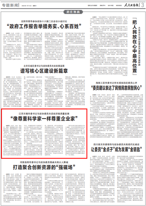 《人民政协报》2023年1月14日第03版刊发了《“像尊重科学家一样尊重企业家”——江苏体育365_365bet投注技巧_365bet注册网址委书记与政协委员共话经济高质量发展》。