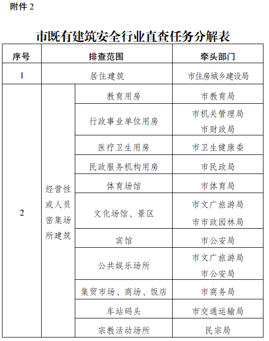 (3)行业直查。各相关行业主管部门按照排查职责(见附件 2),制定本行业既有建筑排查方案,进行排查摸底,形成分行业的隐患建筑清单。